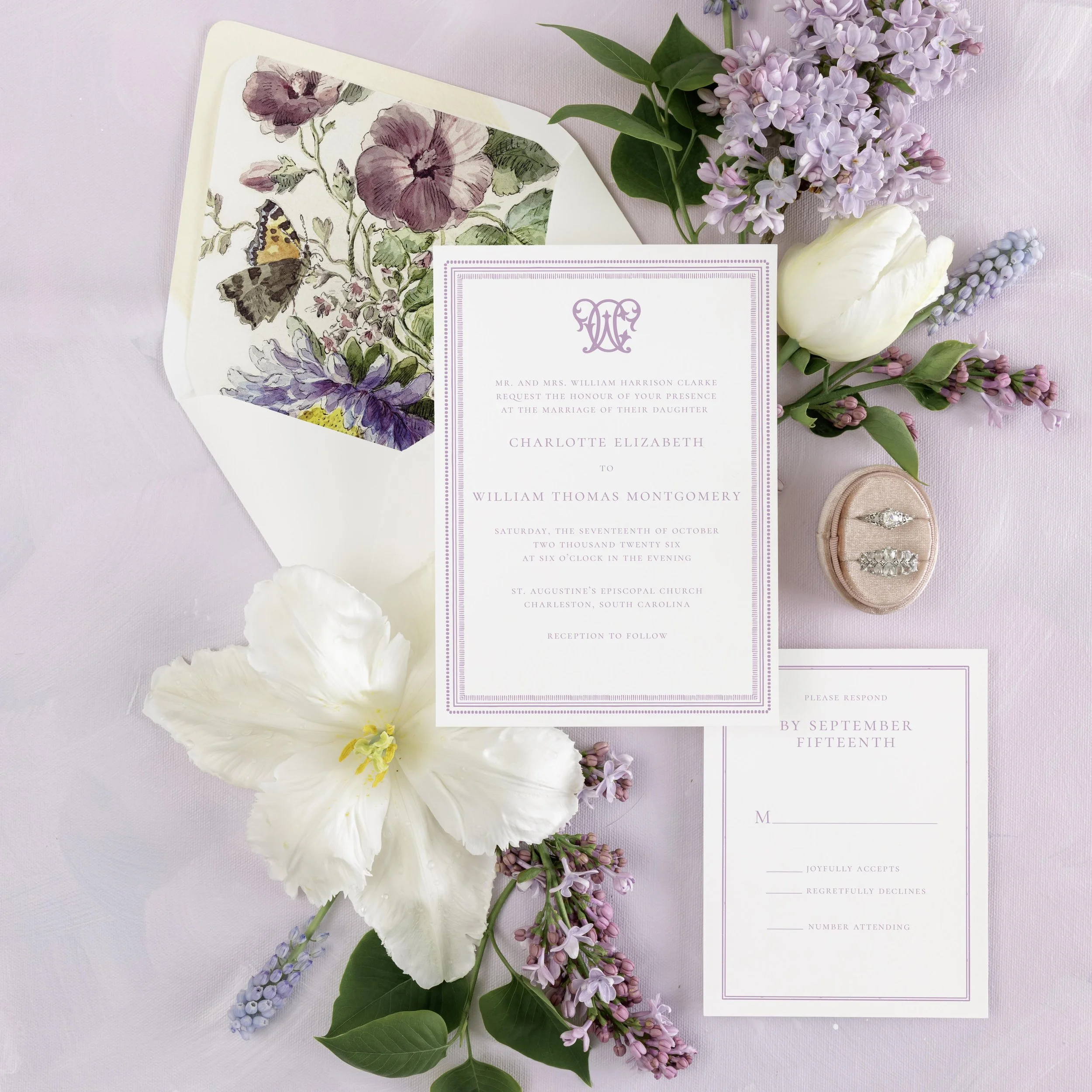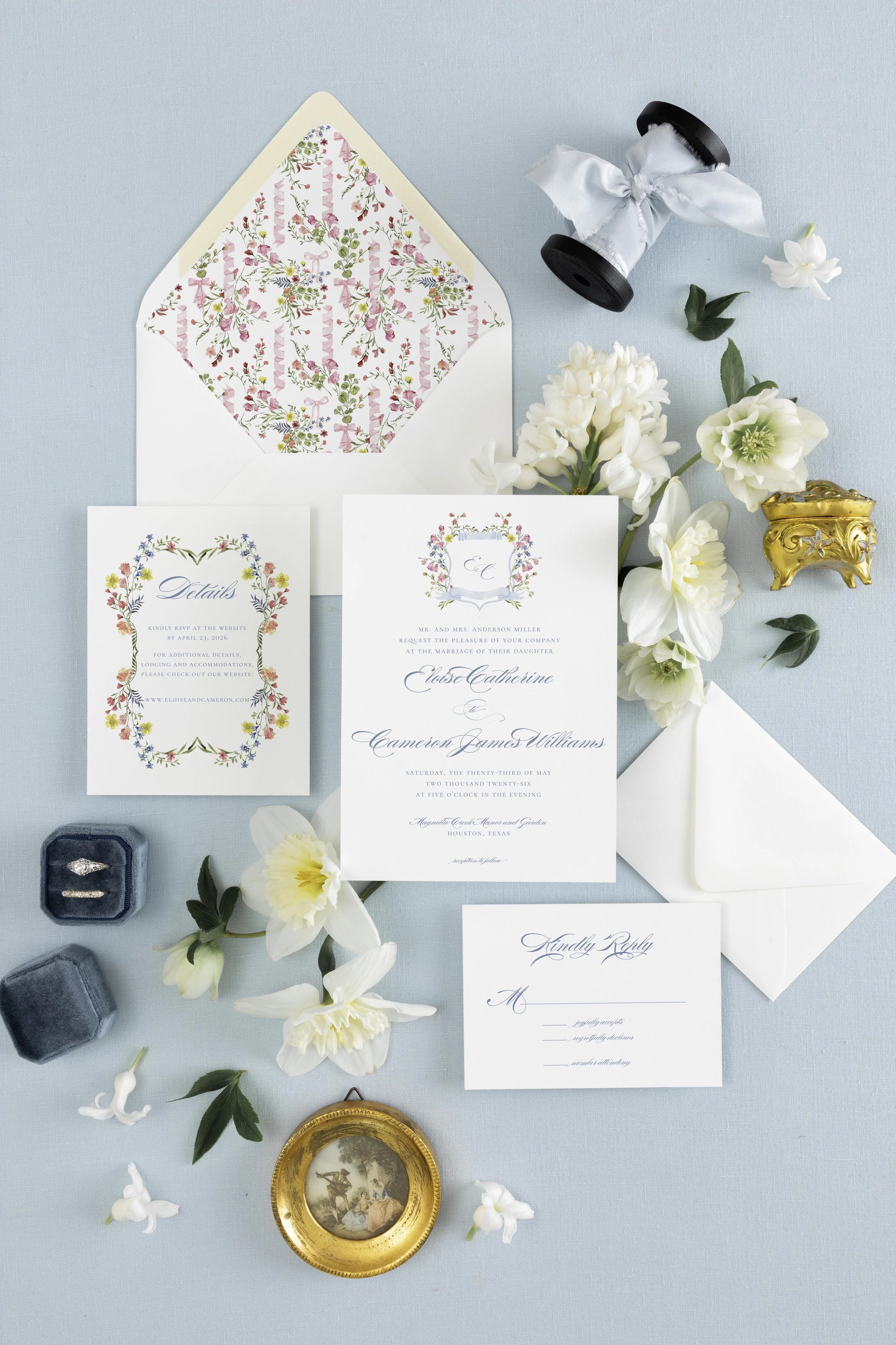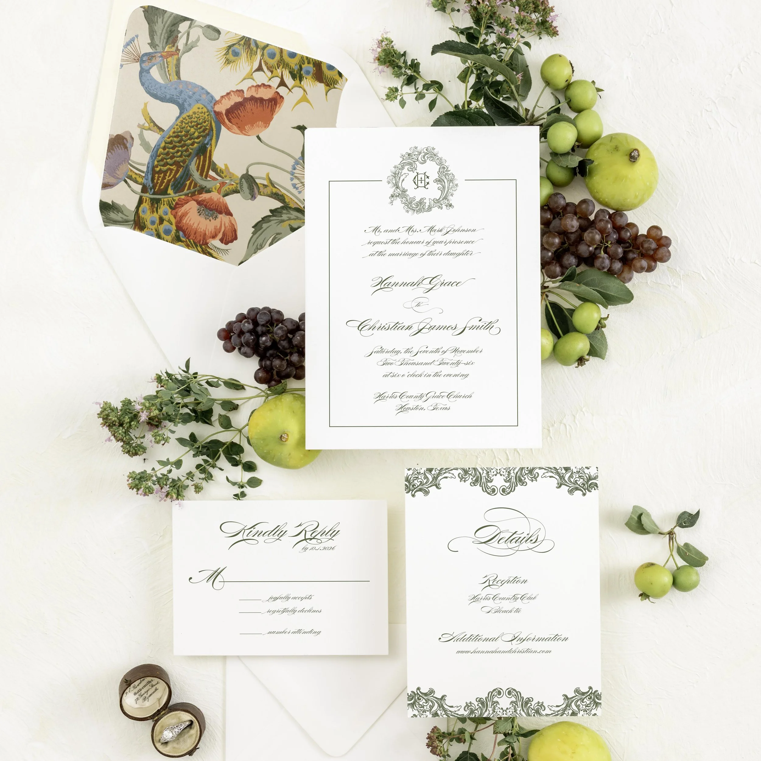 Every invitation suite is different just like every couple has a unique love story. The invitation and other items such as an RSVP card or Details card can be done completely in calligraphy. Other elements such as a monogram or a crest can be added and can be incorporated into your one of a kind invitation suite including colored envelopes, liners, ribbons, or wax seals.